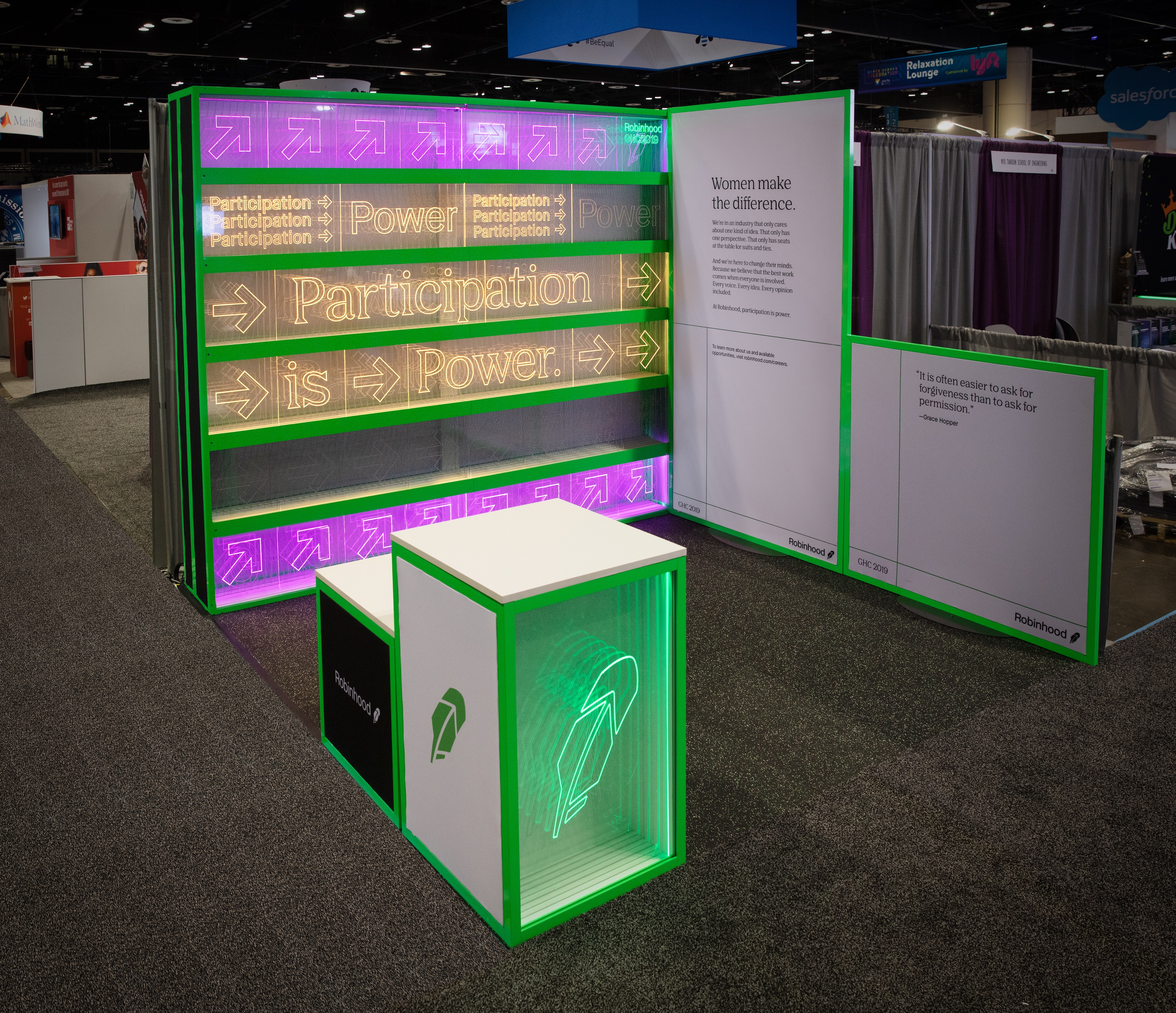 We collaborated with the brand design team at Robinhood on a booth design for GHC19. We wanted to create an environment that had the dynamics of something electronic, but the tactility and dimension of something analog. Using edge-lit acrylic etched with graphics and messaging, we created a wall mural that could be animated with frenetic energy, to tell a story of participation, power, and forward momentum.